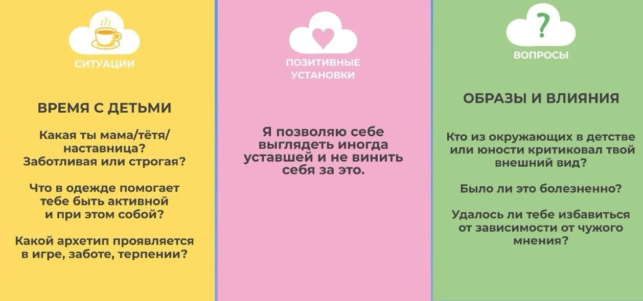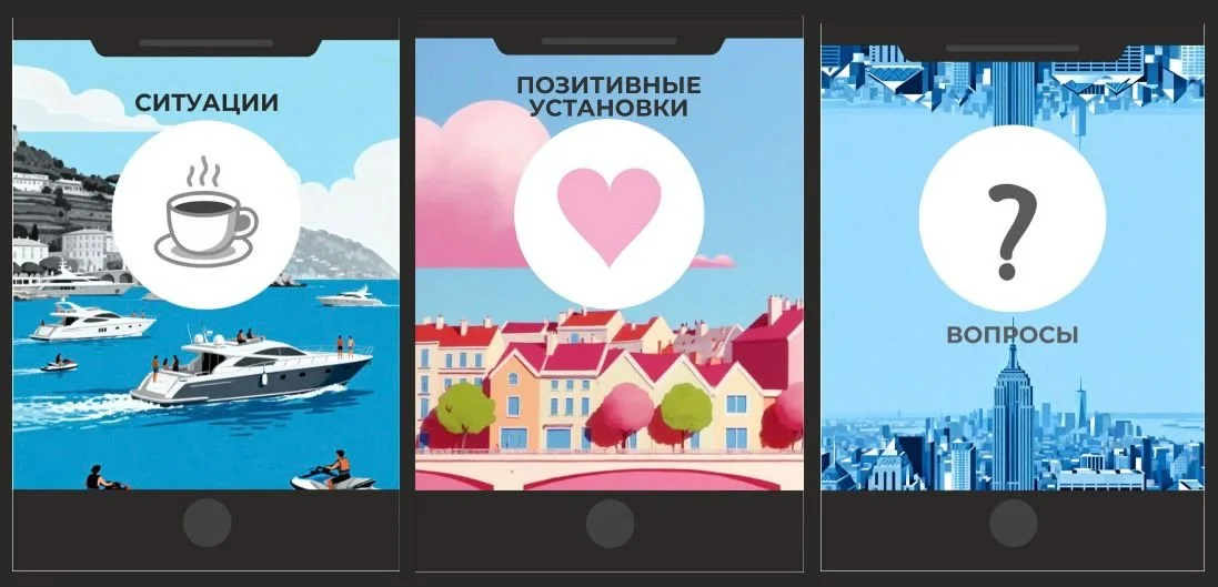 И 3 текстовые колоды: Вопросы, Ситуации, Позитивные установки